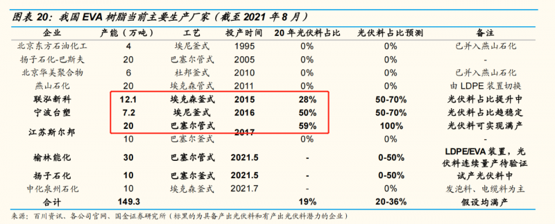縱觀所有具備EVA產(chǎn)能的國內(nèi)企業(yè),能夠生產(chǎn)光伏級EVA的也只有斯?fàn)柊?、?lián)泓新科和寧波臺塑三家。榆林能化、揚子石化、中化泉州石化均在2021年5-7月投產(chǎn)EVA材料,但暫未具備生產(chǎn)光伏級EVA的能力。