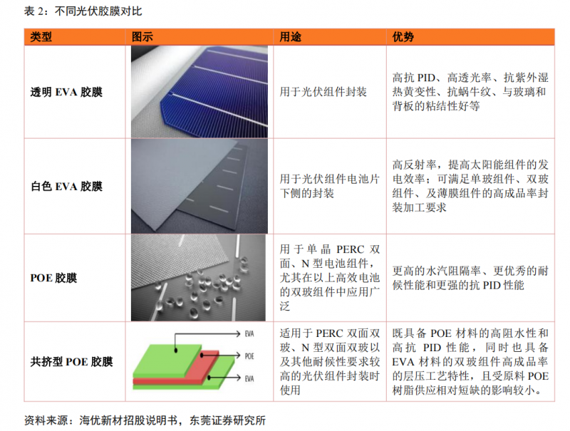 具體來看,EVA樹脂性能優(yōu)良、價格便宜,是當(dāng)下最最主流的膠膜原材料。在組件技術(shù)發(fā)展過程中,通過增加電池片下層膠膜反射率的方式,讓更多的陽光射到電池片上,因此行業(yè)中衍生出白色EVA膠膜。