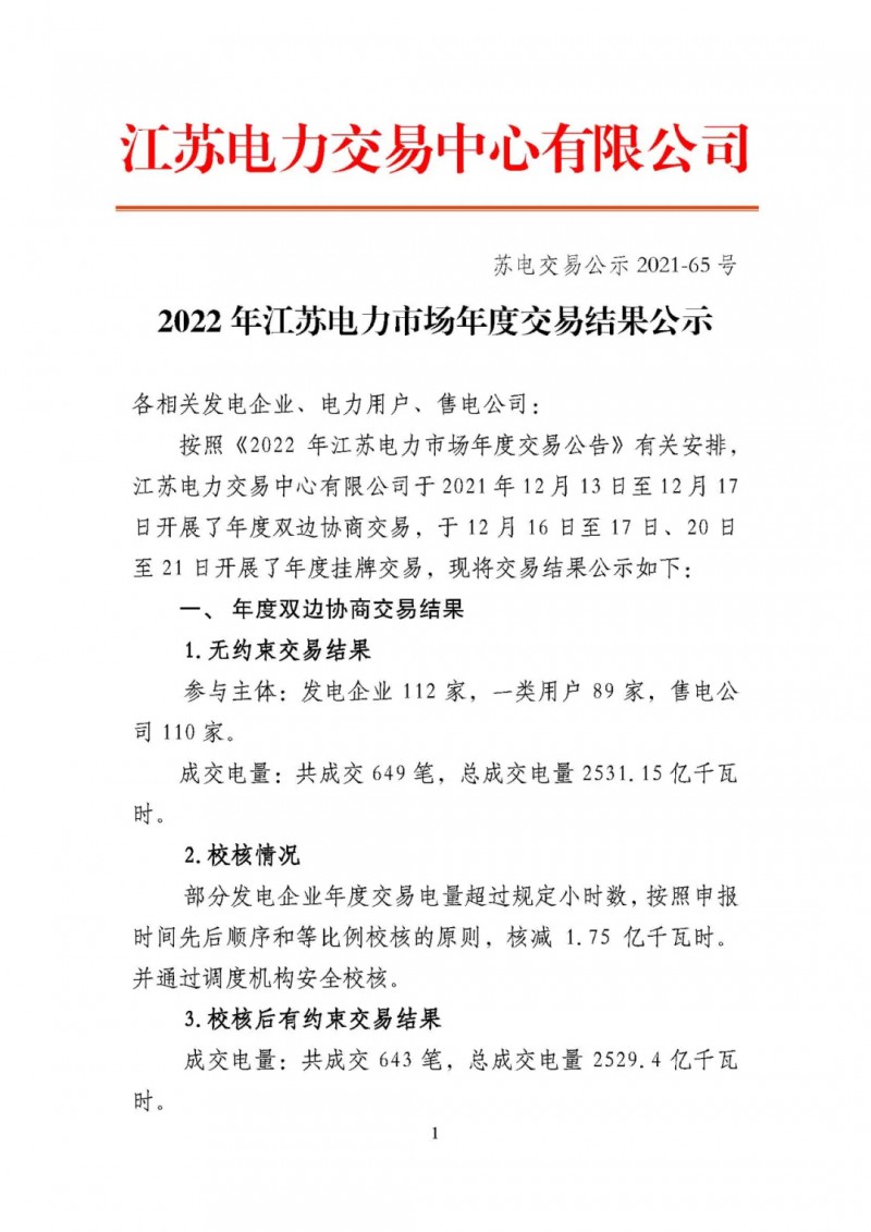 12月23日,江蘇電力交易中心有限公司發(fā)布了2022年江蘇電力市場年度交易結果。江蘇電力交易中心有限公司于2021年12月13日至12月17日開展了年度雙邊協(xié)商交易,于12月16日至17日、20日至21日開展了年度掛牌交易。