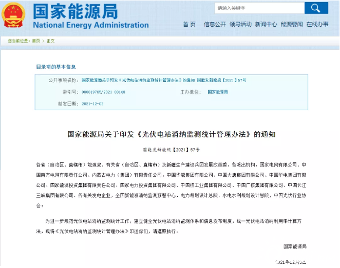 12月20日,國家能源局發(fā)布關(guān)于印發(fā)《光伏電站消納監(jiān)測統(tǒng)計(jì)管理辦法》的通知。