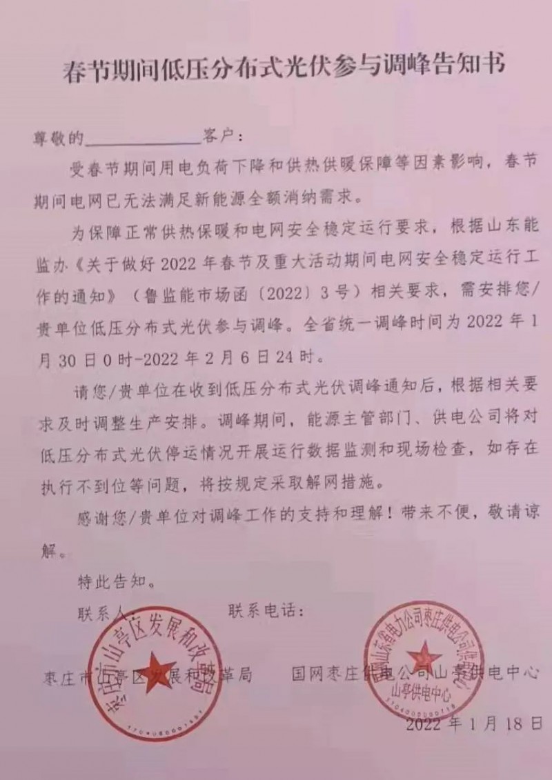 隨后,各地級市也根據(jù)精神,下發(fā)了《春節(jié)期間低壓分布式光伏參與調(diào)峰告知書》。
