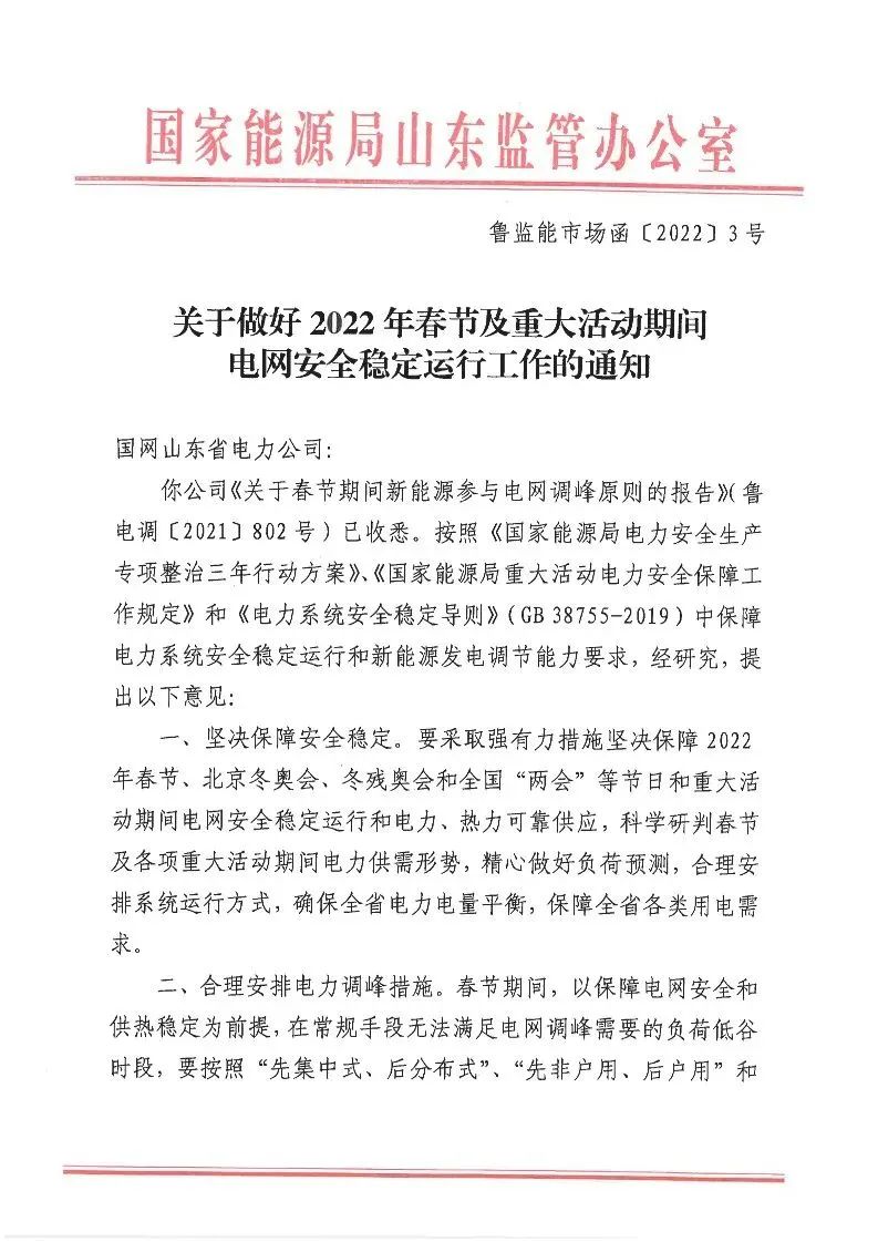 2022年1月22日,國家能源局山東監(jiān)管辦公室發(fā)布《關(guān)于做好 2022年春節(jié)及重大活動期間電網(wǎng)安全穩(wěn)定運行工作的通知》,提出: