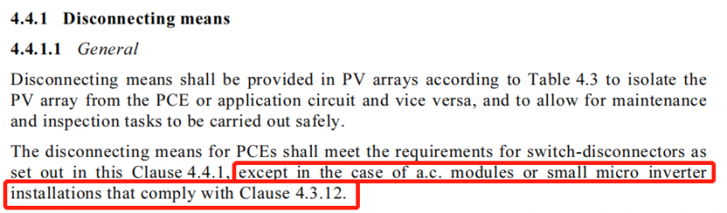 根據(jù)AS/NZS 5033:2014標(biāo)準(zhǔn)中提到:對非交流組件或小型微型逆變器安裝的系統(tǒng)而言,組件和逆變器之間需要安裝斷開裝置;對交流組件或小型微型逆變器安裝的系統(tǒng)則不需要安裝直流側(cè)斷開裝置。
