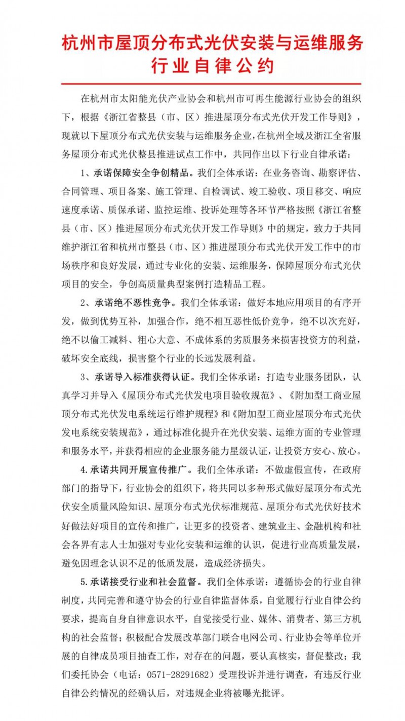 為踐行該《導(dǎo)則》在杭州全域及浙江全省的推廣應(yīng)用,在杭州市太陽能光伏產(chǎn)業(yè)協(xié)會和杭州市可再生能源行業(yè)協(xié)會的組織下,浙江正泰新能源開發(fā)有限公司、龍焱能源科技(杭州)有限公司、杭州桑尼能源科技股份有限公司、杭州福斯特光伏發(fā)電有限公司、杭州帷盛科技有限公司、德鄰聯(lián)合工程有限公司、浙江交投新能源投資有限公司、浙江天裕能源有限公司、浙江維旺合縱能源科技有限公司、杭州城市能源有限公司、泛太能源環(huán)境(浙江)有限公司、浙江寰泰新能源有限公司、浙江拓華能源科技有限公司、潔云電力工程(杭州)有限公司、杭州眾能光電科技有限公司共十五家光伏企業(yè),根據(jù)《導(dǎo)則》條款,聯(lián)合簽署了《杭州市屋頂分布式光伏安裝與運(yùn)維服務(wù)行業(yè)自律公約》,帶頭向社會公開承諾加強(qiáng)行業(yè)自律,共同維護(hù)浙江省和杭州市整縣(市、區(qū))推進(jìn)屋頂分布式光伏開發(fā)工作中的市場秩序和良好發(fā)展。