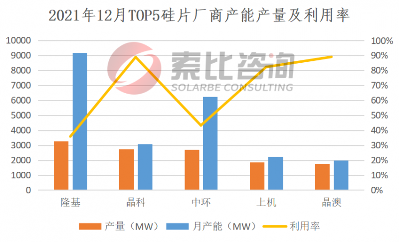 2021年12月,兩家頭部硅片企業(yè)開工率上升至50%和60%,但終端需求不及預(yù)期。2021年12月國內(nèi)硅片產(chǎn)量17.85GW,環(huán)比下降8.6%。按照產(chǎn)量排名,隆基、晶科、中環(huán)、上機(jī)、晶澳位列前五,企業(yè)總產(chǎn)量12.35GW,占比69.19%,綜合利用率67.81%。預(yù)計12月份硅片產(chǎn)量將有小幅回升。從供應(yīng)端來看,2022年1月份硅料產(chǎn)量將小幅上漲,硅片也有新產(chǎn)能投產(chǎn)。從需求端來看,終端需求預(yù)期將出現(xiàn)小幅提升。