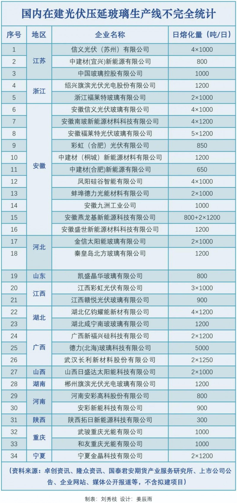 據(jù)某玻璃行業(yè)專家統(tǒng)計(jì),不包括擬建項(xiàng)目在內(nèi),目前國(guó)內(nèi)在建光伏壓延玻璃生產(chǎn)線合計(jì)產(chǎn)能約4萬(wàn)噸/日。而2022年的新增產(chǎn)能理論上應(yīng)該在1.5萬(wàn)噸~2萬(wàn)噸/日。