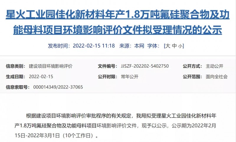 星火工業(yè)園佳化新材料年產(chǎn)1.8萬(wàn)噸氟硅聚合物及功能母料項(xiàng)目