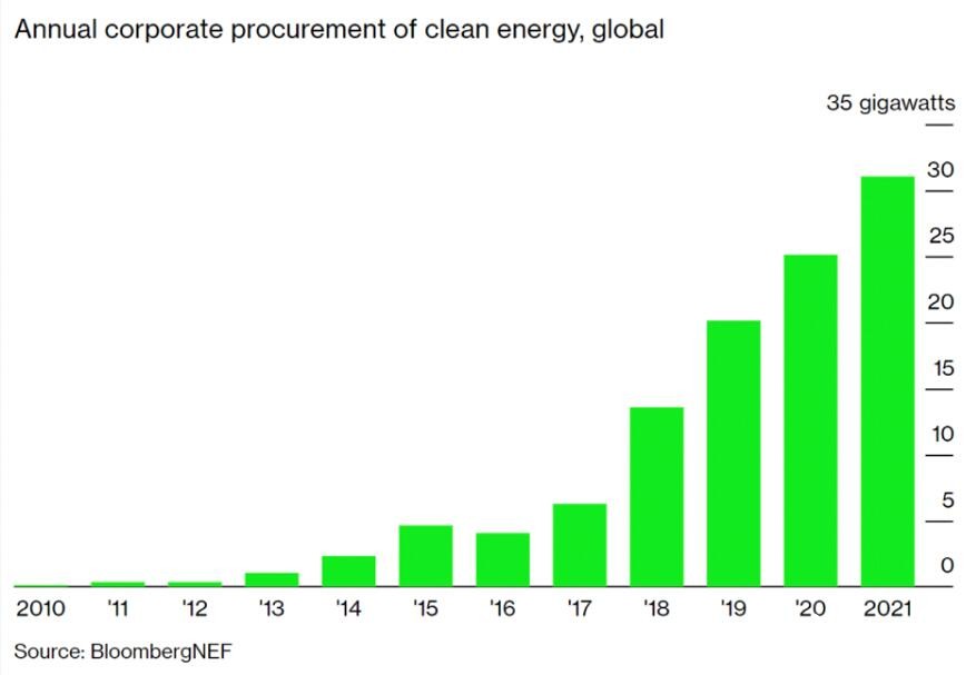 2021年有 67 家公司加入了 RE100(100%可再生能源倡議),總計有 355 家公司承諾使用 100% 可再生能源。2021年全球企業(yè)采購可再生能源合同的容量創(chuàng)下了 31GW 的新紀(jì)錄。其中大部分產(chǎn)能是在美洲采購的,其中 17GW 來自美國的企業(yè),3.3GW 來自北美和南美的其他國家的企業(yè)。