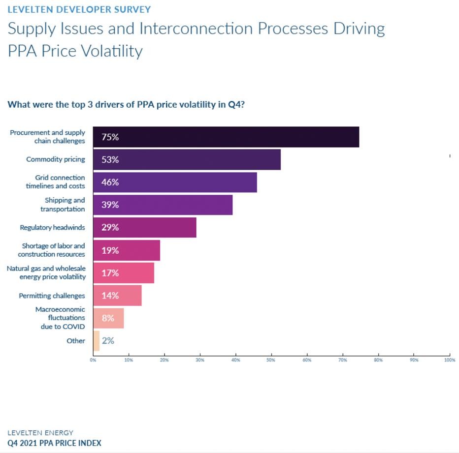 上述創(chuàng)紀(jì)錄的太陽能光伏的采購是在光伏成本上升的情況下發(fā)生的。LevelTen Energy的一項調(diào)查表明,由于需求增加、宏觀經(jīng)濟(jì)波動、供應(yīng)鏈問題以及其他因素的影響,光伏成本從 2020 年初開始上漲。據(jù)LevelTen Energy 的最新報告, 2021 年第四季度購電協(xié)議( PPA) 價格指數(shù)顯示光伏價格上漲了 5.7%,達(dá)到34.25 美元/兆瓦時。