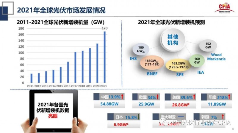 2022年2月23日,2021年發(fā)展回顧與2022年形勢(shì)展望線上研討會(huì)采用直播形式順利召開(kāi),中國(guó)光伏行業(yè)協(xié)會(huì)名譽(yù)理事長(zhǎng)王勃華出席會(huì)議并作2021年光伏行業(yè)發(fā)展回顧與2022年形勢(shì)展望,王勃華指出,2021年我國(guó)光伏行業(yè)繼續(xù)高歌猛進(jìn),制造端,應(yīng)用端,進(jìn)出口都取得了快速增長(zhǎng),2022年我國(guó)光伏市場(chǎng)在巨大的規(guī)模儲(chǔ)備下或?qū)⒃鲋?5GW以上。