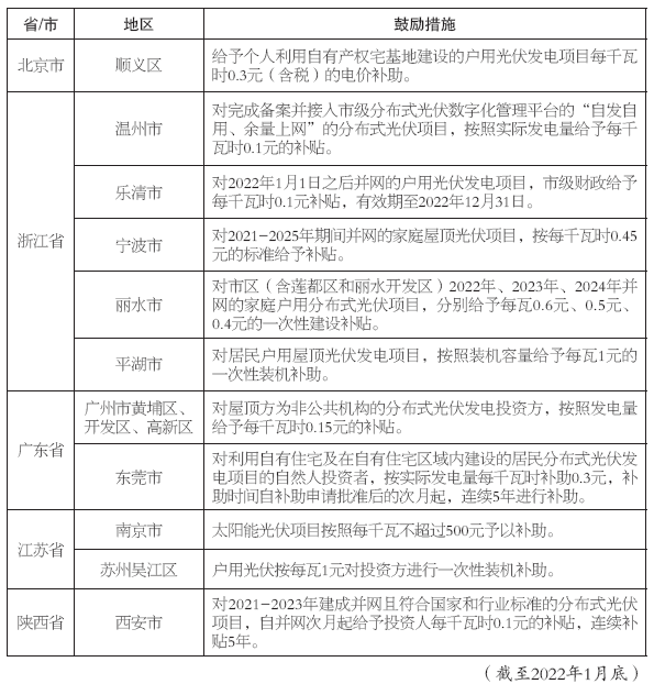 表1 戶(hù)用光伏地區(qū)性鼓勵(lì)措施一覽表