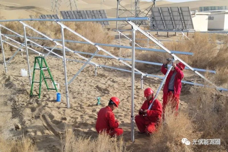 從1月18日人員入場平整場地開始,施工人員每天都自帶午餐加快施工進度。3月初太陽能設(shè)備到場后,施工人員按照施工工序全面鋪開。截至目前,86個螺旋樁基礎(chǔ)已全部完成,安裝支架30個,安裝太陽能板4個。