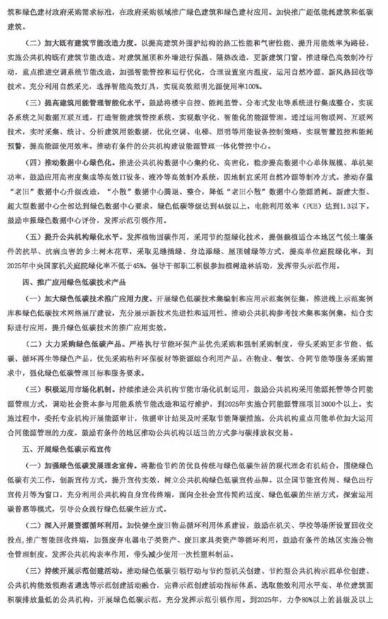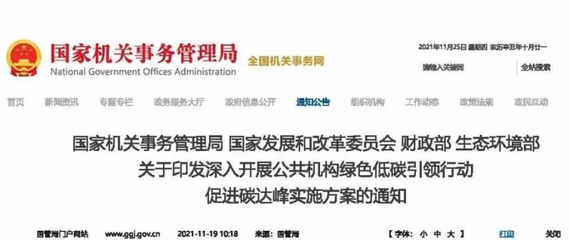國(guó)家機(jī)關(guān)事務(wù)管理局、國(guó)家發(fā)改委、財(cái)政部、生態(tài)環(huán)境部發(fā)布關(guān)于印發(fā)深入開展公共機(jī)構(gòu)綠色低碳引領(lǐng)行動(dòng)、促進(jìn)碳達(dá)峰實(shí)施方案的通知。