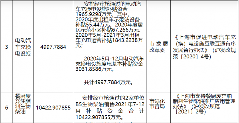 (四)按照《上海市支持餐廚廢棄油脂制生物柴油推廣應(yīng)用管理辦法》(滬發(fā)改規(guī)范〔2021〕2號(hào))規(guī)定,安排經(jīng)審核通過(guò)的2家單位B5生物柴油銷售2021年7-12月補(bǔ)貼資金合計(jì)10422.907855萬(wàn)元。