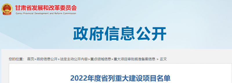 2022年甘肅省省列重大建設(shè)項目投資計劃已經(jīng)省政府審定,并以甘政辦發(fā)〔2022〕11號文件印發(fā)實施。共234個項目,其中計劃新開工項目80個,續(xù)建項目138個,預(yù)備項目16個。具體名單如下:計劃新開工項目(80個)