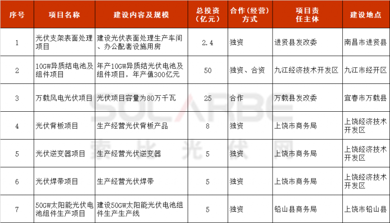 其中7個(gè)光伏項(xiàng)目入冊,分別是:南昌市進(jìn)賢縣光伏支架表面處理項(xiàng)目、九江市經(jīng)開區(qū)年產(chǎn)10GW異質(zhì)結(jié)光伏電池及組件項(xiàng)目、宜春市萬載縣風(fēng)電光伏項(xiàng)目(光伏項(xiàng)目容量為80萬千瓦)、上饒經(jīng)濟(jì)技術(shù)開發(fā)區(qū)光伏背板項(xiàng)目、光伏逆變器項(xiàng)目、光伏焊帶項(xiàng)目以及上饒市鉛山縣50GW太陽能光伏電池組件生產(chǎn)等7個(gè)項(xiàng)目。
