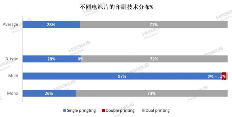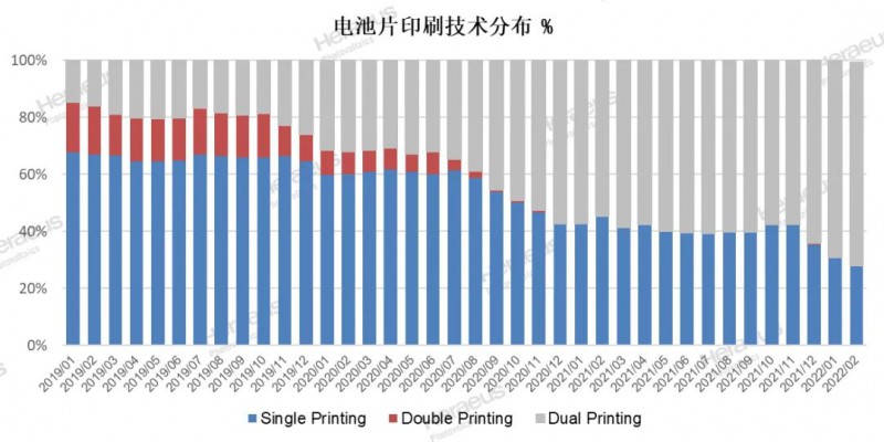 和一月份數(shù)據(jù)相比,單次印刷的比例再次下降3個(gè)百分點(diǎn) ,達(dá)到了28%。N型印刷方式的選擇也更傾向于分布印刷。