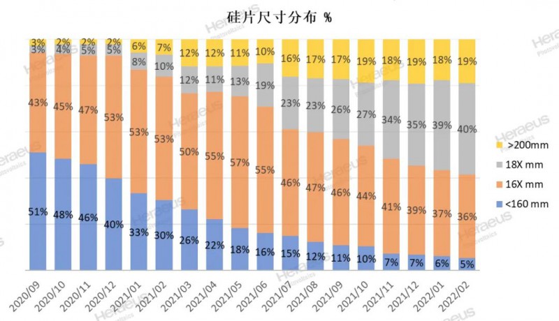 經(jīng)歷了短短不到一年半的時(shí)間,大尺寸硅片(≥M6)的市場(chǎng)占有率從2020年9月的49%迅速爬坡至95%。