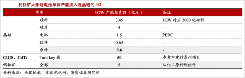 光伏企業(yè)投資1GW晶硅電池,需要從硅料、硅片、電池、組件合計超過9億元;而協(xié)鑫納米披露的數(shù)據(jù)顯示,其建造的鈣鈦礦百兆瓦產(chǎn)線投資為1億元,1GW的投資僅為5億元。也就是說,1GW鈣鈦礦電池的投資強(qiáng)度僅為晶硅的一半。