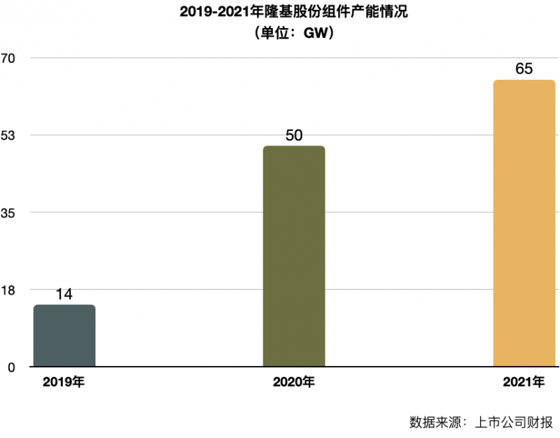 2019年,隆基單晶組件產(chǎn)能達(dá)到14吉瓦。根據(jù)2020年報(bào)公布數(shù)據(jù),其單晶組件銷量達(dá)到24.53吉瓦,組件產(chǎn)能更是達(dá)到50吉瓦,并計(jì)劃至2021年底達(dá)到65吉瓦。