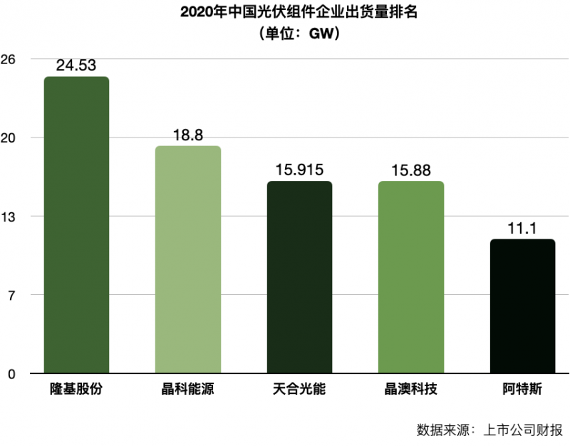 2020年,隆基股份組件出貨量爆增至24.53吉瓦,魚(yú)躍登上了全球光伏組件出貨排名的“鐵王座”,成為中國(guó)組建廠商的“執(zhí)牛耳者”。