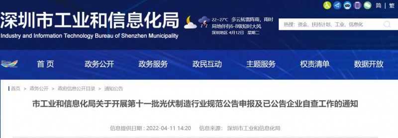 深圳市工業(yè)和信息化局發(fā)布關(guān)于開(kāi)展第十一批光伏制造行業(yè)規(guī)范公告申報(bào)及已公告企業(yè)自查工作的通知。