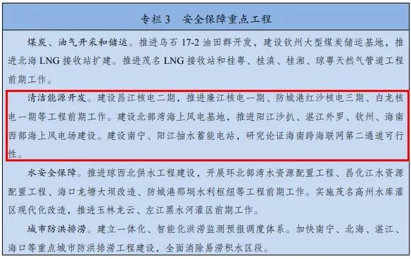 根據(jù)《實施方案》,北部灣城市群將開展安全保障重點工程,其中,清潔能源開發(fā)方面,將建設(shè)昌江核電二期,推進(jìn)廉江核電一期、防城港紅沙核電三期、白龍核電一期等工程前期工作。建設(shè)北部灣海上風(fēng)電基地,推進(jìn)陽江沙扒、湛江外羅、欽州、海南西部海上風(fēng)電場建設(shè)。建設(shè)南寧、陽江抽水蓄能電站,研究論證海南跨海聯(lián)網(wǎng)第二通道可行性。