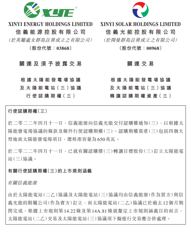 4月11日,信義能源及信義光能聯(lián)合公布公告稱,于2022年4月11日信義能源向信義光能交付認(rèn)購權(quán)通知(三),以根據(jù)太陽能發(fā)電場協(xié)議的條款及條件行使認(rèn)購期權(quán)(三)。認(rèn)購期權(quán)資產(chǎn)(三)包括四個大型地面太陽能發(fā)電場項(xiàng)目,總核準(zhǔn)容量為650兆瓦。