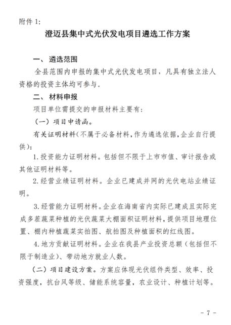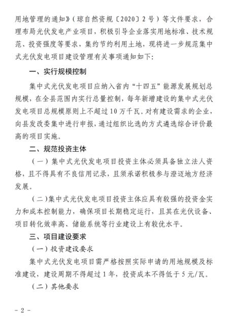 文件規(guī)定了澄邁縣集中式光伏發(fā)電項(xiàng)目應(yīng)納入省內(nèi)“十四五”能源發(fā)展規(guī)劃總規(guī)模,在全縣范圍內(nèi)實(shí)行總量控制,每年新增建設(shè)的集中式光伏發(fā)電項(xiàng)目總規(guī)模原則上不超過(guò)10萬(wàn)千瓦。對(duì)有建設(shè)需求的企業(yè),向縣發(fā)改委集中進(jìn)行申報(bào),通過(guò)組織比選的方式遴選綜合評(píng)價(jià)最高的項(xiàng)目實(shí)施。