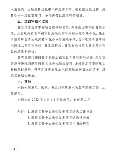 4月11日,澄邁縣發(fā)展和改革委員會(huì)、澄邁縣自然資源和規(guī)劃局、澄邁縣農(nóng)業(yè)農(nóng)村局、澄邁縣工業(yè)信息化和科學(xué)技術(shù)局聯(lián)合發(fā)布了《關(guān)于進(jìn)一步規(guī)范集中式光伏發(fā)電項(xiàng)目建設(shè)管理的通知》。本通知自2022年5月12日起施行,有效期2年。