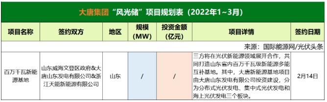 截至2022年3月31日,大唐集團共簽約(規(guī)劃)1個風光儲項目,該項目只簽署了合作協(xié)議。