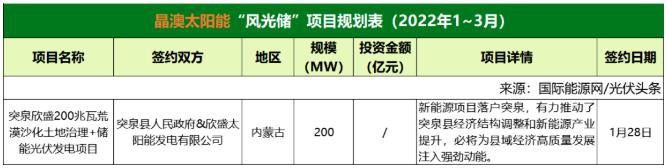 截至2022年3月31日,晶澳太陽能共簽約(規(guī)劃)1個風光儲項目,項目規(guī)模為200MW。