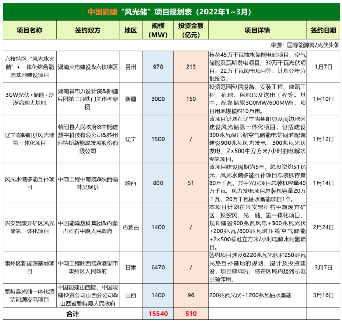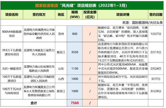 截至2022年3月31日,國家能源集團共簽約(規(guī)劃)5個風光儲項目,明確項目規(guī)模共計7.56GW。