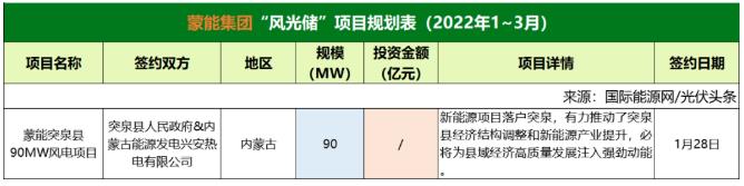 截至2022年3月31日,蒙能集團共簽約(規(guī)劃)1個風光儲項目,項目規(guī)模為90MW。