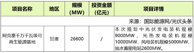 值得注意的是,甘肅酒泉市阿克塞哈薩克族自治縣人民政府發(fā)布文件顯示,阿克塞千萬千瓦級可再生能源基地規(guī)劃中光伏發(fā)電裝機規(guī)模9000MW,光熱發(fā)電裝機規(guī)模10000MW,風電裝機規(guī)模5000MW,抽水蓄能電站2600MW,規(guī)模合計26.6GW。