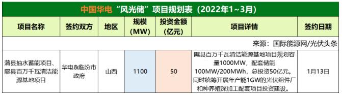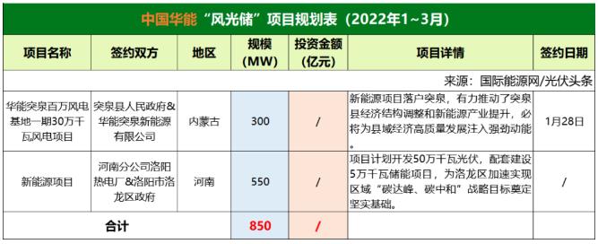 截至2022年3月31日,華能共簽約(規(guī)劃)2個風光儲項目,明確規(guī)模共計850MW。