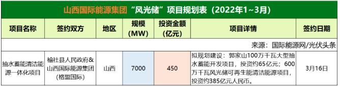 截至2022年3月31日,山西國際能源集團共簽約(規(guī)劃)1個風光儲項目,項目規(guī)模為7000MW,投資金額450億元。