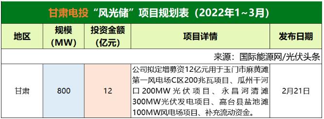 截至2022年3月31日,甘肅電投共規(guī)劃1個風光儲項目,項目規(guī)模為800MW,投資金額12億元。