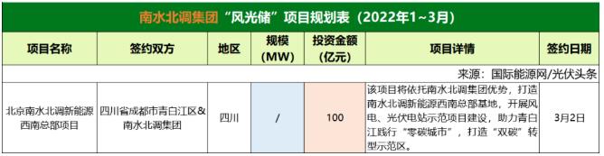 截至2022年3月31日,南水北調集團共簽約(規(guī)劃)1個風光儲項目,投資金額為100億元。