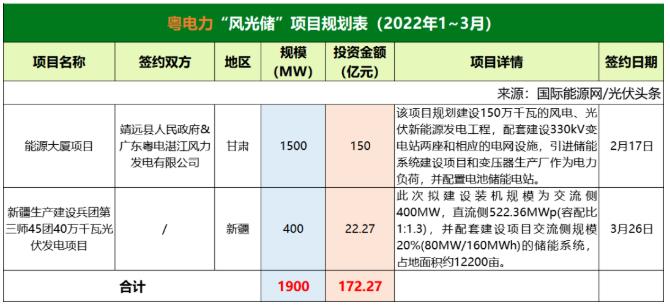 截至2022年3月31日,粵電力共簽約(規(guī)劃)2個風光儲項目,明確規(guī)模共計1.9GW,明確投資金額共計172.27億元。