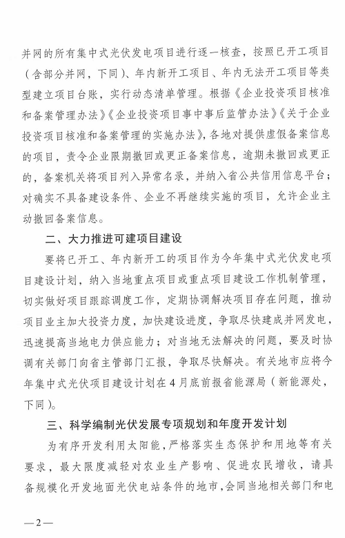 2.大力推進可建項目建設(shè):要將已開工、年內(nèi)新開工的項目作為今年集中式光伏發(fā)電項目建設(shè)計劃,納入當(dāng)?shù)刂攸c項目或重點項目建設(shè)工作機制管理,