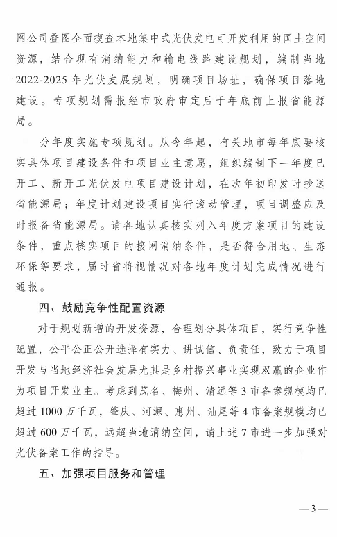 4.鼓勵競爭性配置資源:考慮到茂名、梅州、清遠(yuǎn)等3市備案規(guī)模均已超過1000萬千瓦,肇慶、河源、惠州、汕尾等4市備案規(guī)模均已超過600萬千瓦,遠(yuǎn)超當(dāng)?shù)叵{空間,請上述7市進一步加強對光伏備案工作的指導(dǎo)。