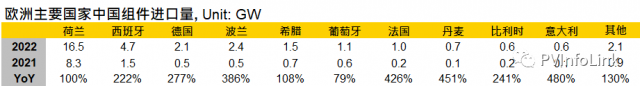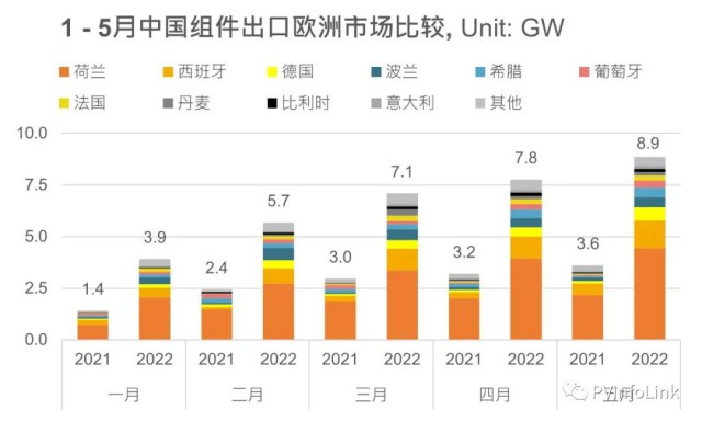 目前中國主要出口成長的區(qū)域市場,仍是目前能源轉(zhuǎn)型最積極,同時(shí)也因俄羅斯和烏克蘭沖突下能源供應(yīng)不穩(wěn)定而面臨能源危機(jī)的歐洲。歐洲五月從中國進(jìn)口了8.9GW的光伏組件,同比成長146%,1 – 5月則是累計(jì)了33.3GW,同比成長144%,為各區(qū)域市場中成長最高。2021年歐洲全年進(jìn)口量已經(jīng)是最高的40.9GW,占中國2021年出口的46%,在基期已高且今年仍呈現(xiàn)逐月成長的態(tài)勢下,印證了歐洲市場對于光伏產(chǎn)品的需求仍然強(qiáng)勁。
