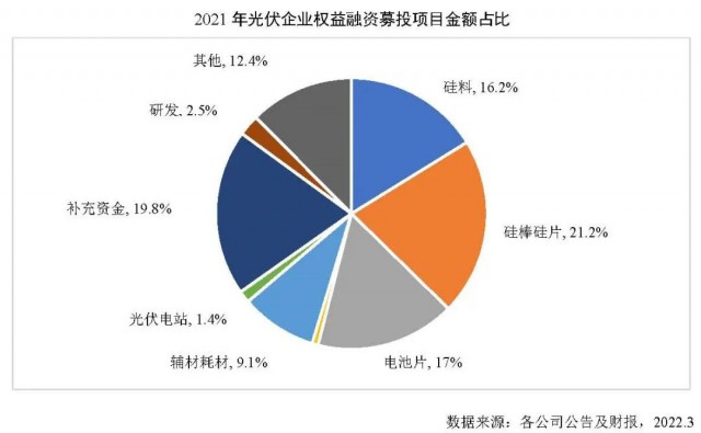 2021年我國(guó)光伏行業(yè)融資環(huán)境持續(xù)改善,共27家光伏企業(yè)在A股及港股資本市場(chǎng)使用權(quán)益融資方式募資,涉及權(quán)益融資項(xiàng)目28個(gè),募資總額1058.33億元,同比增長(zhǎng)48.2%。其中,再融資項(xiàng)目21個(gè),募集資金758億元,同比增長(zhǎng)30%;IPO上市融資項(xiàng)目7個(gè),募集資金301億元,同比增長(zhǎng)129.2%。截至2022年3月,2021年權(quán)益融資項(xiàng)目中,已完成融資合計(jì)700.77億元,同比增長(zhǎng)16.3%。