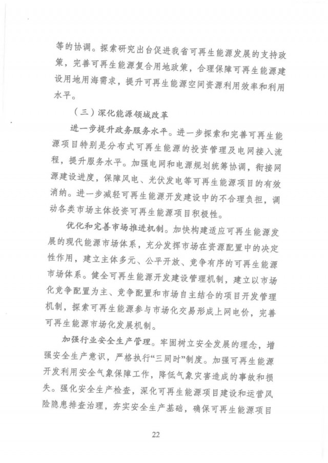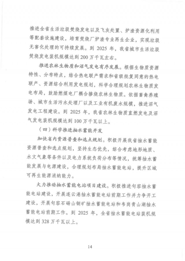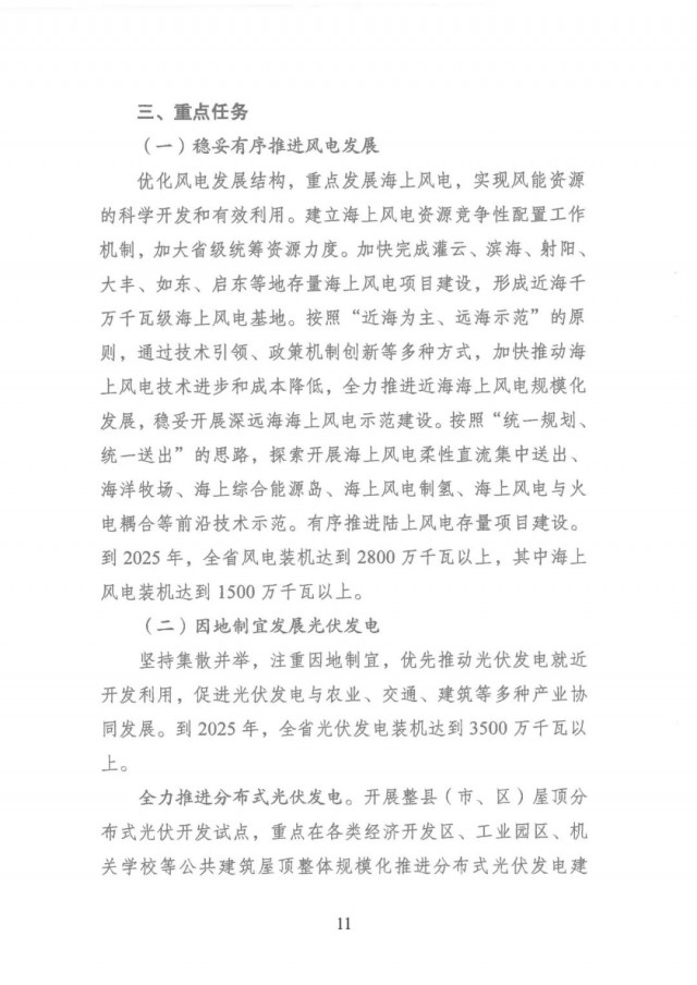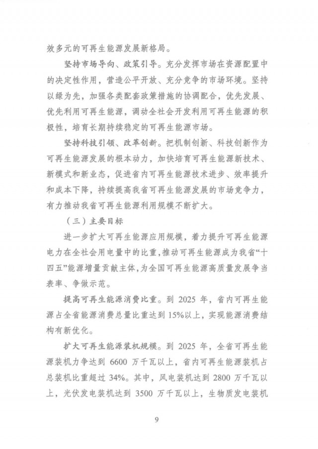 ● 擴(kuò)大可再生能源裝機(jī)規(guī)模:到2025年,全省可再生能源裝機(jī)力爭(zhēng)達(dá)到6600萬千瓦以上,省內(nèi)可再生能源裝機(jī)占總裝機(jī)比重超過34%。其中,風(fēng)電裝機(jī)達(dá)到2800萬千瓦以 上,光伏發(fā)電裝機(jī)達(dá)到 3500 萬千瓦以上,生物質(zhì)發(fā)電裝機(jī)達(dá)到300萬千瓦以上,另外,抽水蓄能裝機(jī)達(dá)到328萬千瓦 以上,實(shí)現(xiàn)電力裝機(jī)結(jié)構(gòu)有新跨越。