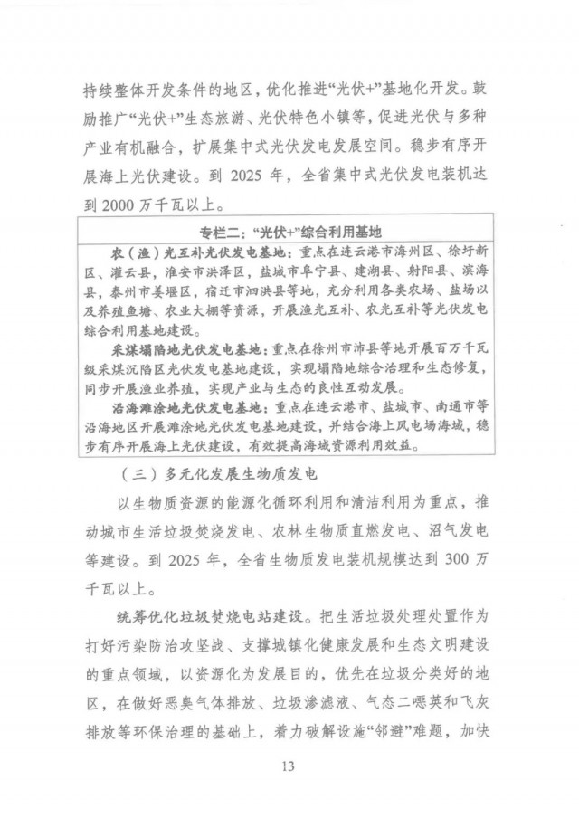 “十四五”期間,江蘇將穩(wěn)妥有序推進(jìn)風(fēng)電發(fā)展,優(yōu)化風(fēng)電發(fā)展結(jié)構(gòu),重點(diǎn)發(fā)展海上風(fēng)電,因地制宜發(fā)展光伏發(fā)電,全力推進(jìn)分布式光伏發(fā)電,穩(wěn)步有序開展海上光伏建設(shè),加快推進(jìn)“光伏+”綜合利用,多元化發(fā)展生物質(zhì)發(fā)電,科學(xué)推進(jìn)抽水蓄能開發(fā),高效多元推動(dòng)非電利用。到2025年,省內(nèi)可再生能源占全省能源消費(fèi)總量比重將達(dá)到15%以上,全省可再生能源裝機(jī)達(dá)到6600萬千瓦以上,占總裝機(jī)比重超過34%。其中,風(fēng)電裝機(jī)達(dá)到2800萬千瓦以上,光伏發(fā)電裝機(jī)達(dá)到3500萬千瓦以上,生物質(zhì)發(fā)電裝機(jī)達(dá)到300萬千瓦以上。