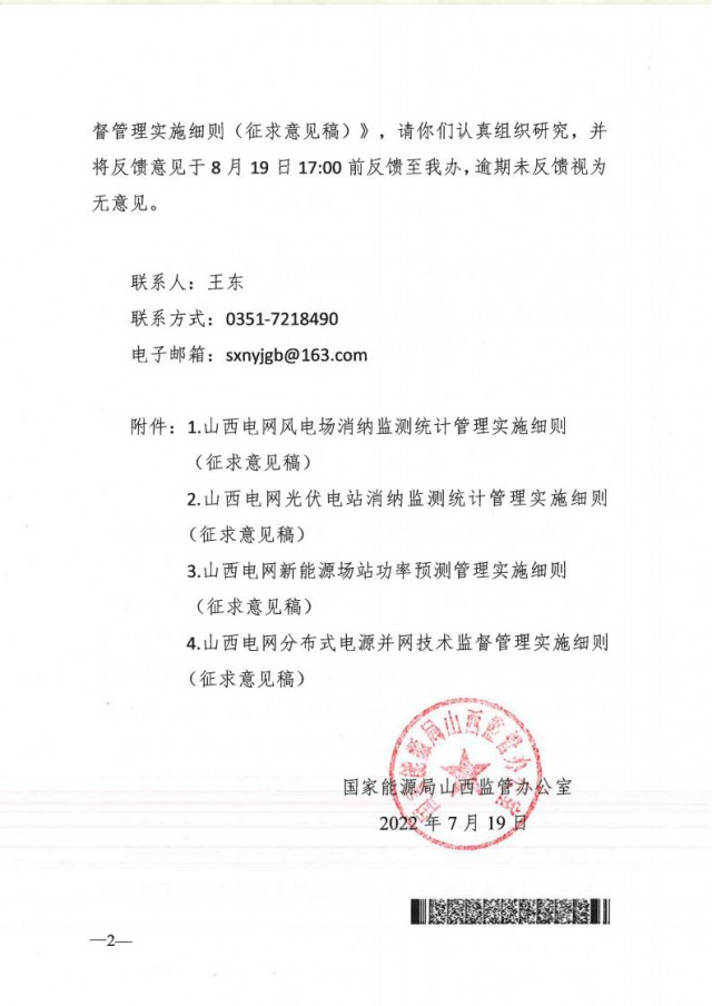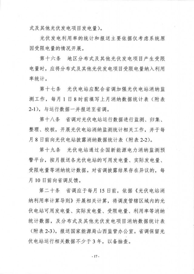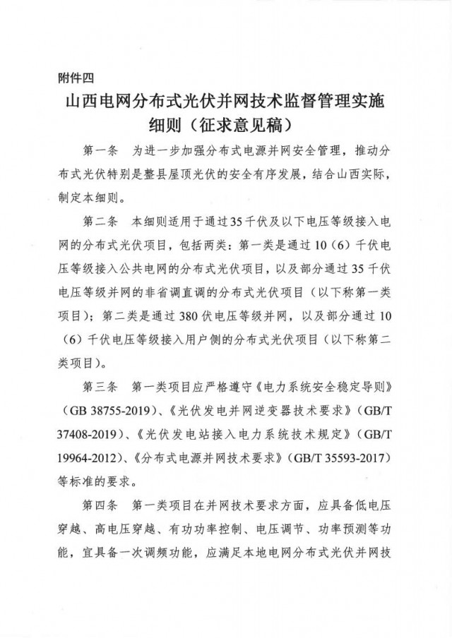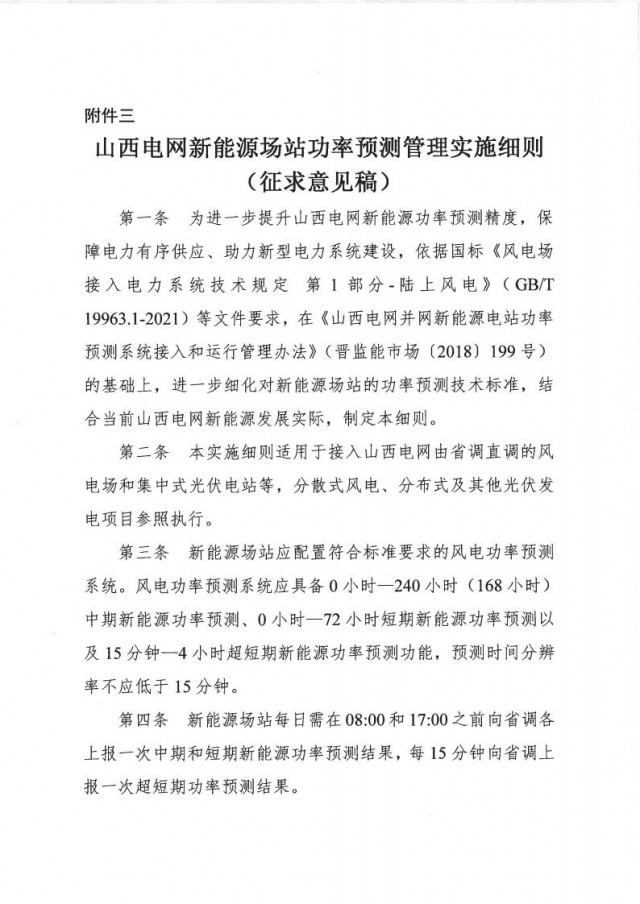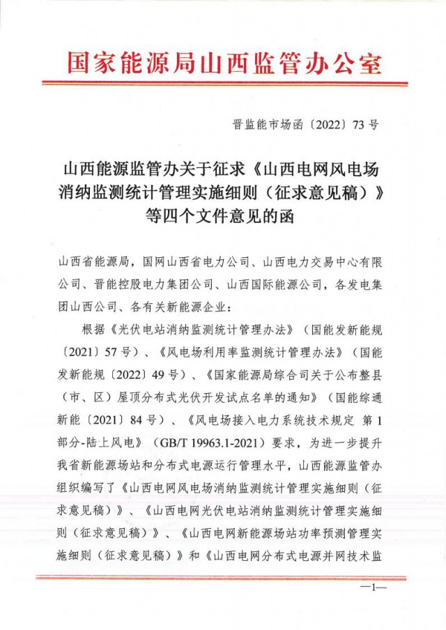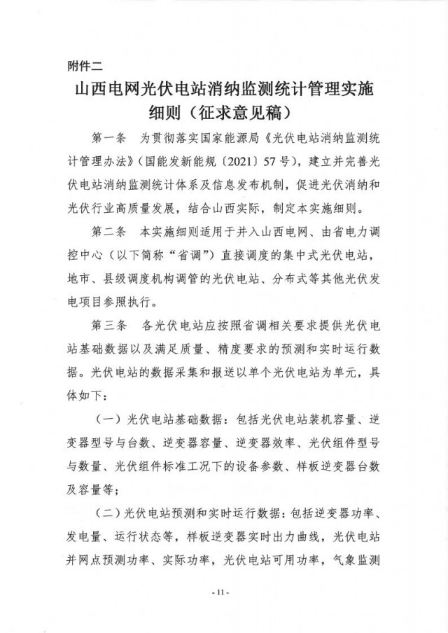 7月26日,山西能源監(jiān)管辦關(guān)于征求《山西電網(wǎng)風(fēng)電消納監(jiān)測(cè)統(tǒng)計(jì)管理實(shí)施細(xì)則(征求意見(jiàn)稿)》等四個(gè)文件意見(jiàn)的函,包含《山西電網(wǎng)光伏電站消納監(jiān)測(cè)統(tǒng)計(jì)管理實(shí)施細(xì)則(征求意見(jiàn)稿)》印發(fā),意見(jiàn)稿指出,本實(shí)施細(xì)則適用于并入山西電網(wǎng)、由省電力調(diào)控中心(以下簡(jiǎn)稱“省調(diào)”)直接調(diào)度的集中式光伏電站,地市、縣級(jí)調(diào)度機(jī)構(gòu)調(diào)管的光伏電站、分布式等其他光伏發(fā)電項(xiàng)目參照?qǐng)?zhí)行。