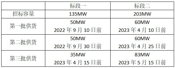 從招標(biāo)公告看,一、二標(biāo)段項(xiàng)目所在地均為新疆昌吉,其中一標(biāo)段招標(biāo)容量135MW,二標(biāo)段招標(biāo)容量203MW,對組件產(chǎn)品的要求均為雙面雙玻組件,峰值功率不低于540Wp。