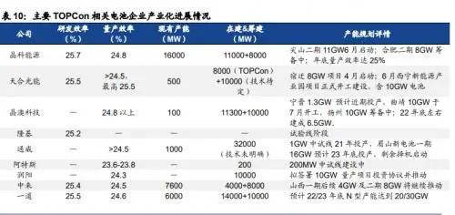 組件端龍頭引領(lǐng),TOPCon進(jìn)入規(guī)模化量產(chǎn)元年,溢價(jià)下經(jīng)濟(jì)性初現(xiàn),國(guó)海證券列舉了各大龍頭布局情況:
