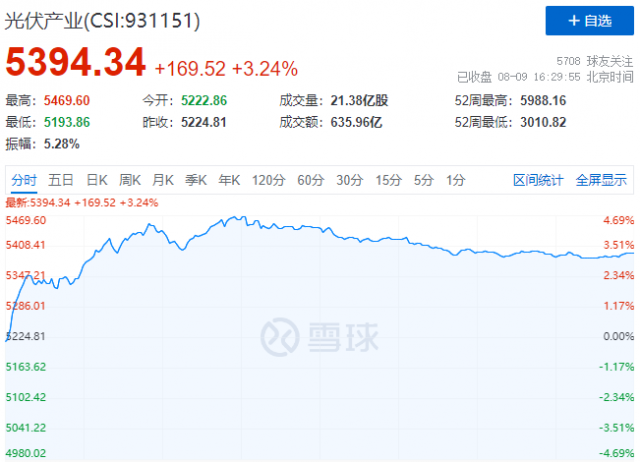 8月9日,調(diào)整一周有余的光伏板塊迎來全線反彈,個(gè)股呈現(xiàn)普漲態(tài)勢(shì),中證光伏產(chǎn)業(yè)指數(shù)(CSI:931151)大漲3.24%,報(bào)收5394點(diǎn)。值得注意的是,近幾個(gè)交易日股價(jià)表現(xiàn)強(qiáng)勢(shì)的部分電池片概念股早盤出現(xiàn)沖高回落的情況,而近期股價(jià)表現(xiàn)較為萎靡的硅片等產(chǎn)業(yè)鏈上游個(gè)股卻集體大漲。